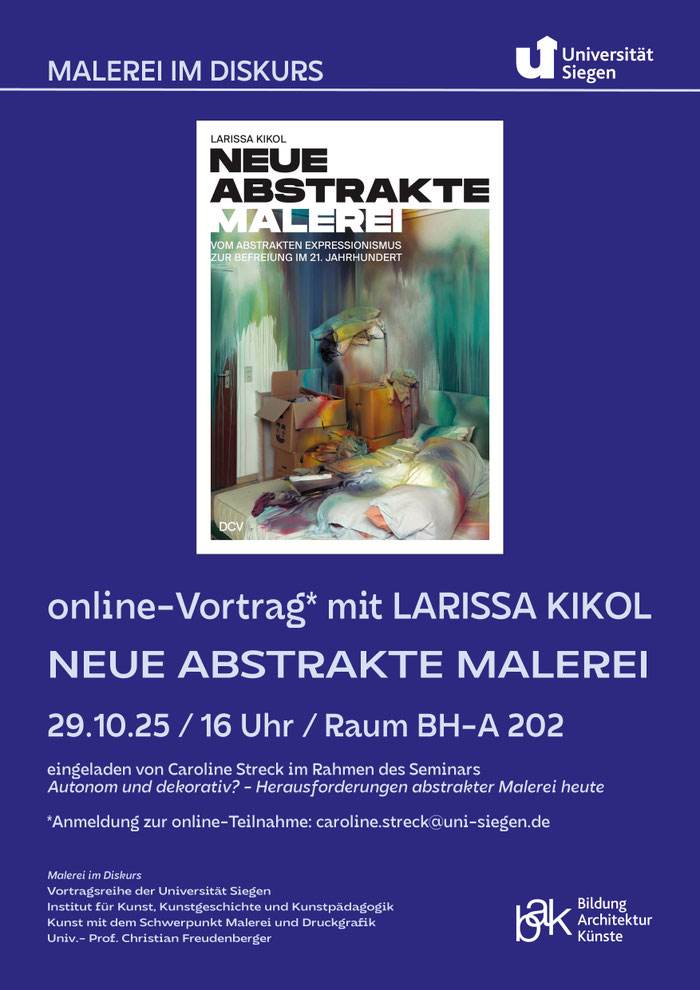Mit Larissa Kikol (*1986) ist eine international bekannte und renommierte freie Kunstkritikerin, Kunstwissenschaftlerin und Autorin an der Universität Siegen zu Gast, die regelmäßig für Kunstmagazine und Zeitungen schreibt, unter anderemKunstforum International, Monopol, Die Zeit und Der Spiegel. Wir begrüßen Larissa Kikol im Rahmen des Seminars „Autonom und dekorativ? Herausforderungen abstrakter Malerei heute“, eingeladen von Caroline Streck, um aktuelle Entwicklungen und zeitgenössische Fragen rund um Abstraktion kritisch zu diskutieren. Ihr gerade erschienener Themenband „Neue Abstrakte Malerei – vom abstrakten Expressionismus zur Befreiung im 21. Jahrhundert“ bildet Grundlage für ihren Vortrag, der Veränderungen seit der Nachkriegszeit sowie aktuelle Strömungen der Abstraktion nachzeichnen und unter anderem Themen und Begrifflichkeiten wie Autonomie, Post-Vandalismus und Dirty Minimalism behandeln wird. Mit der Veranstaltung wollen wir fächerübergreifend Studierende insbesondere der Fachbereiche Kunst, Architektur, Kunstgeschichte und soziale Arbeit ansprechen und zur weiterführenden Diskussion zum Thema einladen.